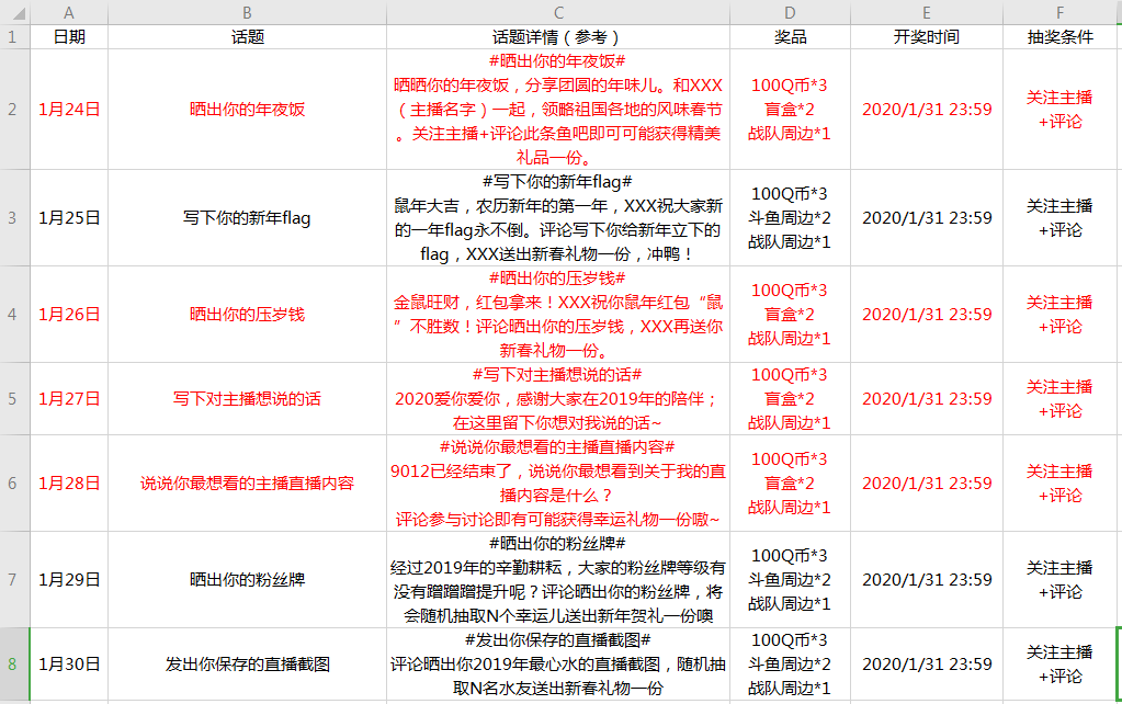 24日的主题是“晒出你的年夜饭”,25日“写下你的新年flag”,26日“晒出你的压岁钱”、27日“写下对主播想说的线日“说说你最想看的主播直播内容”,29日“晒出你的粉丝牌”,30日“发出你保存的直播截图”。每天的奖品都是100Q币*3、盲盒*2、战队周边*1,活动将在31日开奖。