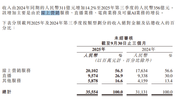 以2025年三季度为例,线%、2.5%、41.3%,占当期总营收比56.5%、26.9%、16.6%。线上营销仍是收入支柱,但14%的增速较2024年同期的26.7%和2025上半年的20.0%明显下滑。昔日主力直播收入增速更落后于其他板块,显示其爆发式增长阶段已经结束。