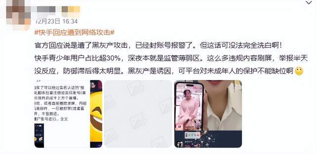 不算多苛求,回顾此次突发事件,快手有态度有实操,整体值得肯定。然事件延续两个多小时,仍令各界有些难以平静。有网友指出:“快手青少年用户占比超30%,深夜本就是监管薄弱时段。大量违规内容刷屏后举报无果,平台防御明显滞后。黑灰产虽是诱因,但对未成年人的保护机制不能缺位。”亦有用户开始担忧,抖音等其他平台是否也会遭受类似攻击。