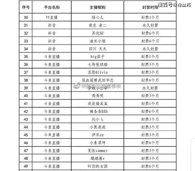 包括斗鱼苏恩、武田华恋、梦蝶、秀秀呢、刘小七、张琪格、big茄子等多位斗鱼主播被封禁,其中被封禁的主播从1个月至永久不等。