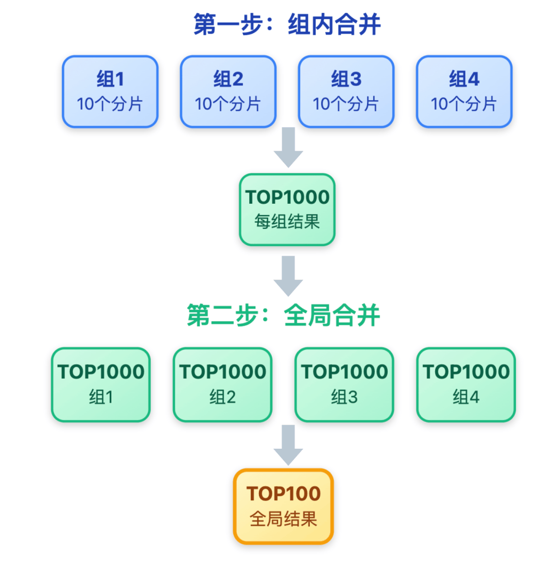 第一步先在组内合并,每个组算出自己的 TOP1000;第二步再合并 10 个组的 TOP1000,得到最终的全局 TOP100。
