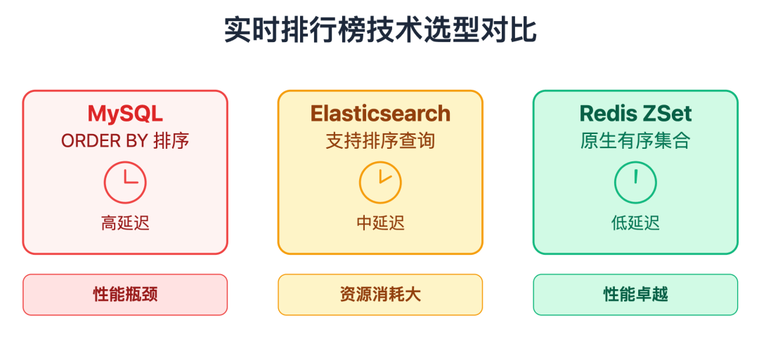 需求明确后,下一步是选对工具。很多同学一上来就说用Redis ZSet,但真实场景的选型要复杂得多。这三个核心工具的组合,直接决定系统的性能天花板。