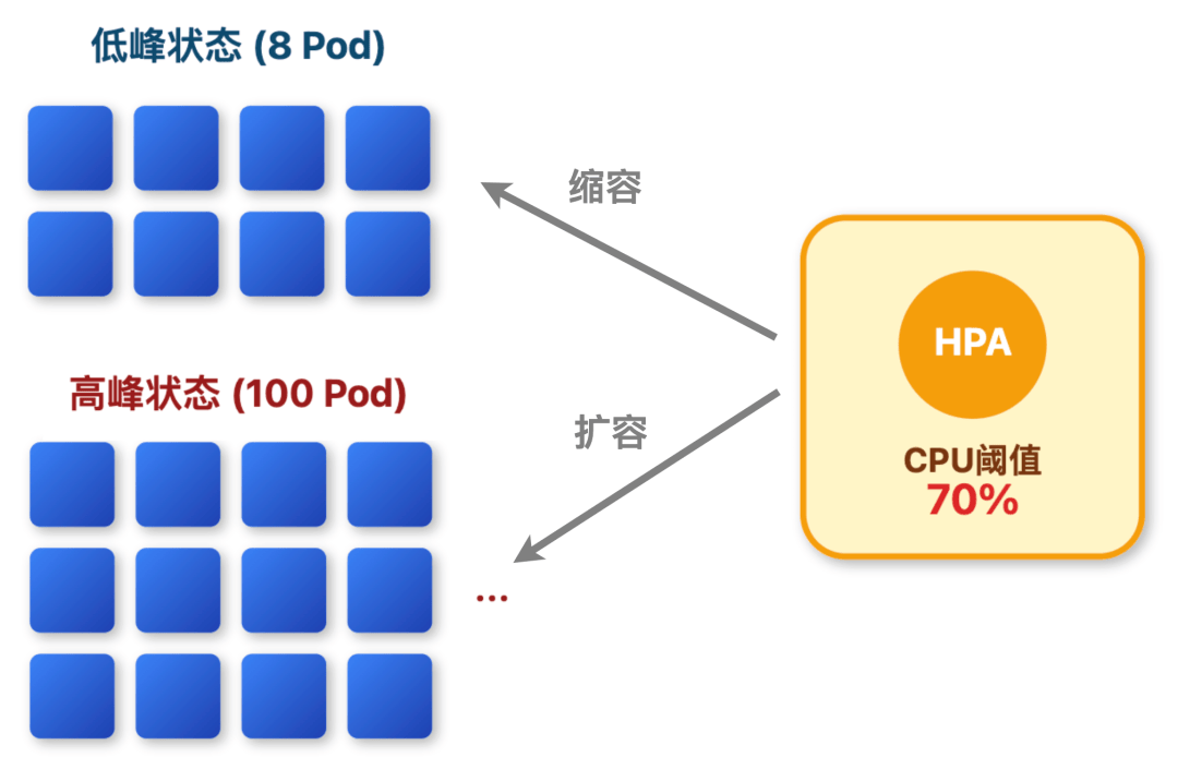 比如把 CPU 利用率 70% 设为阈值:当超过 70% 时,比如晚间 8-10 点用户查榜的高峰时段,集群会自动增加 Pod 数量,最多能扩展到 100 个;而当流量回落,CPU 利用率降低时,又会自动缩减 Pod,最低保留 8 个。