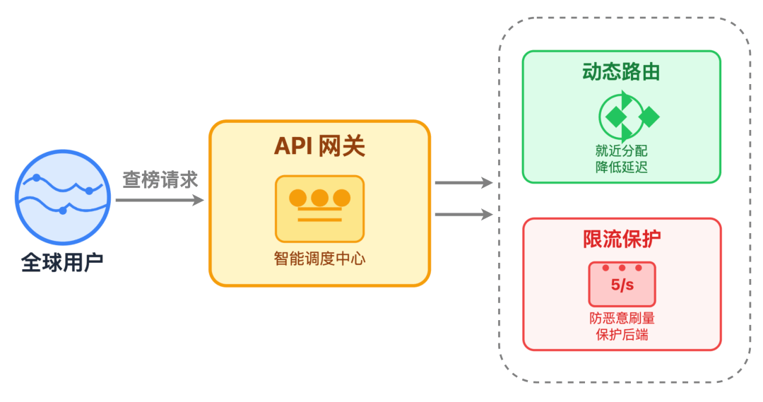 二是限流保护,给单个用户、单个 IP 设定访问上限,比如限制每个用户每秒最多查 5 次榜单,避免恶意刷量冲垮后端服务。