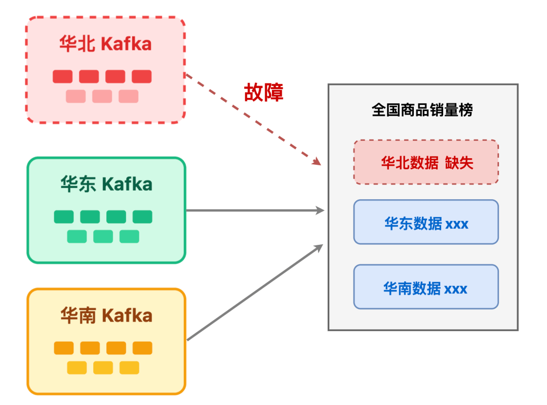 为什么必须多活?设想一下:若仅依赖华北地区的单 Kafka 集群,一旦集群故障,华北用户的下单、加购数据将无法接入,直接导致「全国商品销量榜」 缺失华北区域数据。