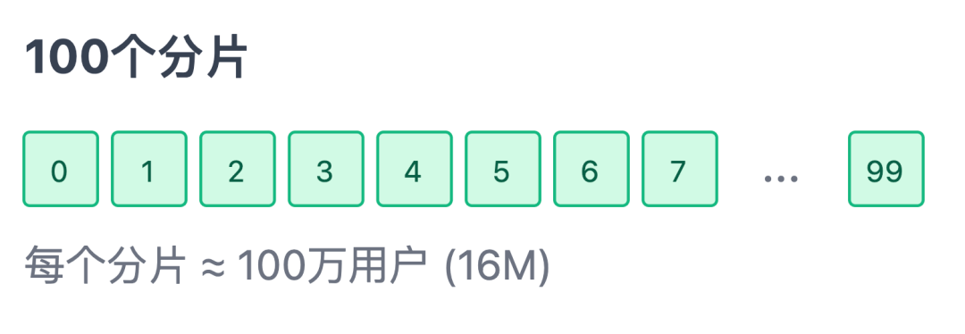 把数据均匀分成 100 个分片,用「用户 ID 除以 100 取余数」的方式,确定每条数据该存入哪个分片;每个分片大约存 100 万用户的榜单数据,约 16 MB
