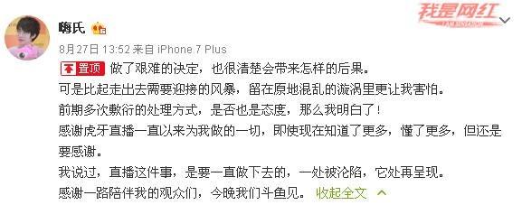 原本只是主播内斗,又演变成嗨氏与平台的纠纷。8月27日,嗨氏在微博发出信息称:“做了艰难的决定,也很清楚会带来怎样的后果……直播这件事,要一直做下去,一处沦陷,它处再呈现……今晚我们斗鱼见。”