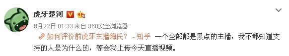 然而,近日,嗨氏与同在虎牙平台的主播楚河打起“口水仗”,《王者荣耀》直播更是停了一周。8月27日,嗨氏在微博宣布,将从虎牙直播转投斗鱼直播。
