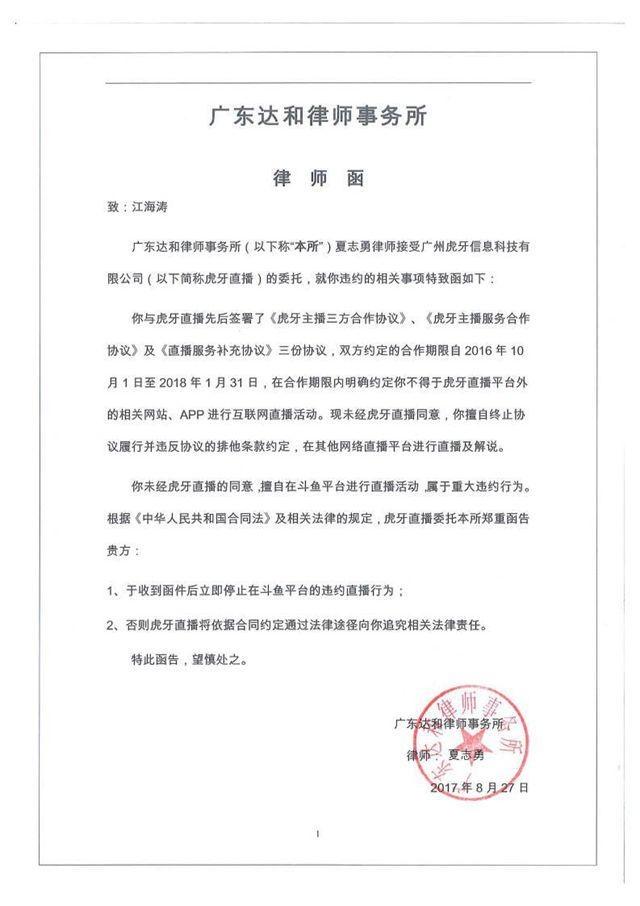 8月27日,虎牙直播官方微博发表声明称,2016年虎牙直播与江海涛签订合作协议,合同期为2018年1月31日。8月27日,嗨氏单方面宣布离开该平台,严重违反双方合作协议,构成单方面违约。当天,虎牙直播还发布致江海涛(主播嗨氏)的律师函。