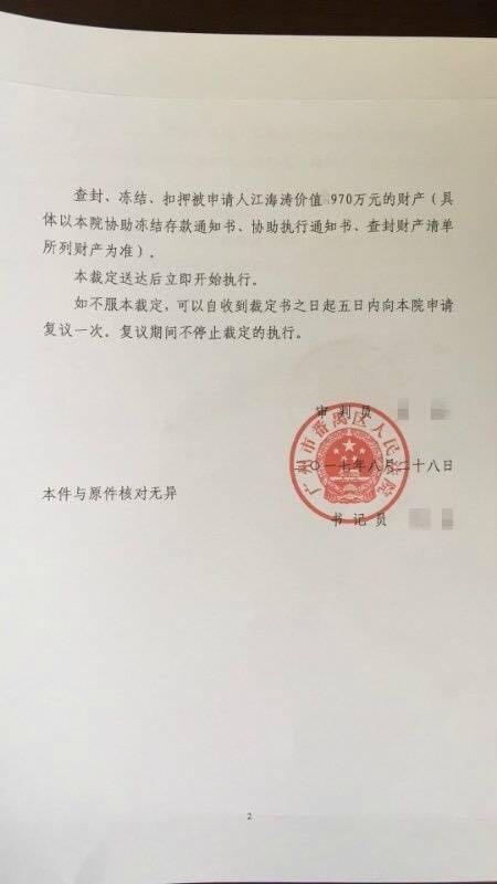 8月28日,虎牙直播发出广州市番禹区人民法院的民事裁决书,申请查封、冻结、扣押江海涛资产。